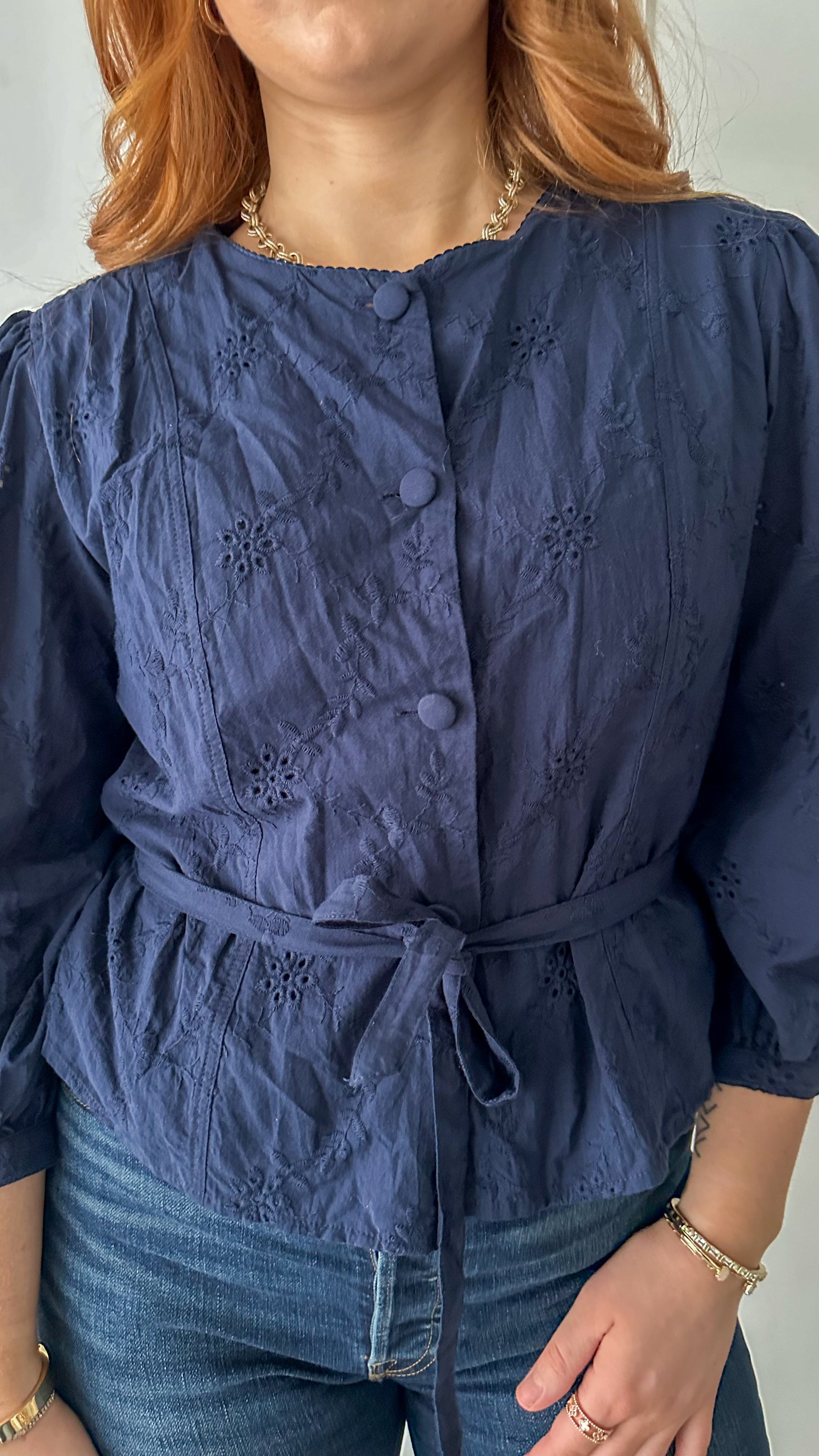 Elevate your wardrobe with the Nicole Belted Shirt, featuring a stunning navy eyelet floral design. This button-down top offers a flattering fit, enhanced by an adjustable belt that cinches your waist for a polished look.